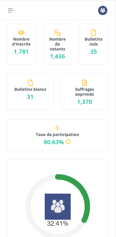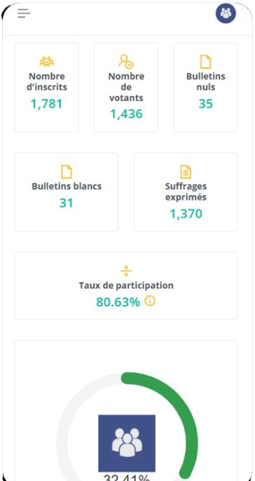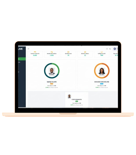 CRM complet avec gestion des données électorales, remontée temps réel, cartographie des bureaux de vote.